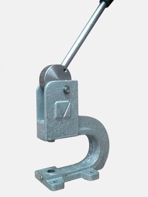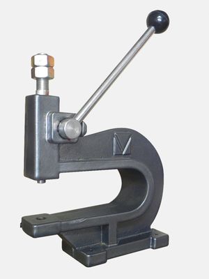 Robusta máquina ojalilladora. Sistema de piñón y cremallera. Diseño moderno. Tuerca y contratuerca para limitar el recorrido de la palanca. Peso: 6,500 kgrs. Garganta 155mm.