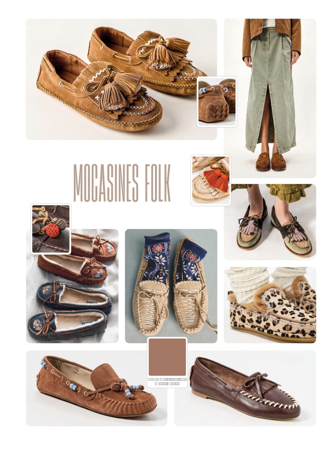 Los mocasines folk se presentan en versiones de base baja, horma redondeada y perfil flexible. Predomina la construcción tipo slip-on con costura perimetral visible, cordones laterales funcionales y aplicaciones superiores como flecos, borlas y lazos. La suela plana, de espesor medio, mantiene una lectura liviana, pensada para uso cotidiano. En algunos modelos se incorporan bases ligeramente elevadas o plantillas forradas que aportan confort sin modificar la silueta tradicional.