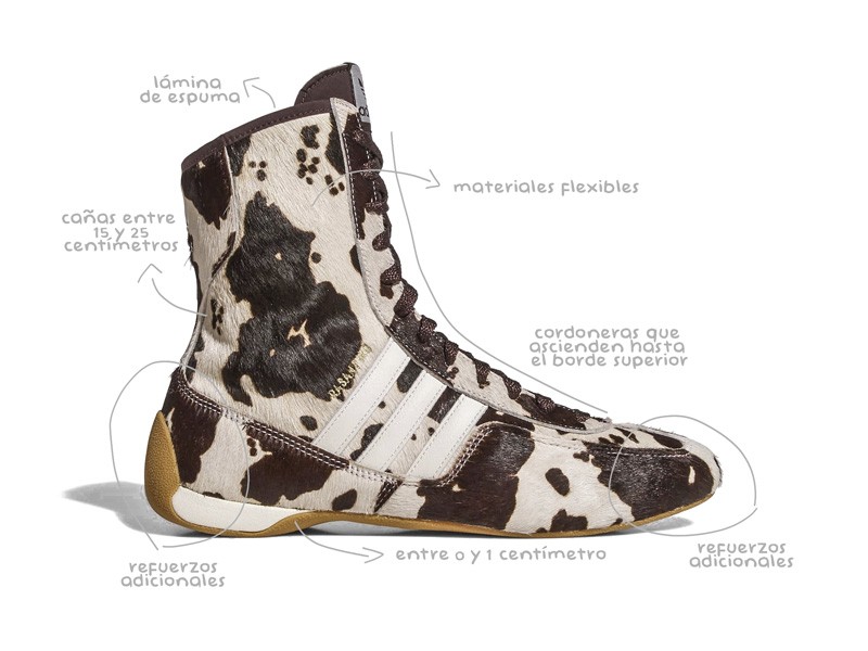 En estos desarrollos, la suela debe conservar un agarre eficiente y bajos niveles de rebote, requisitos que definen la morfología del calzado box. El diseño de la caña, aunque más expresivo en moda, respeta el ancho natural de la pierna y mantiene una silueta estilizada, con líneas ascendentes y volúmenes contenidos.