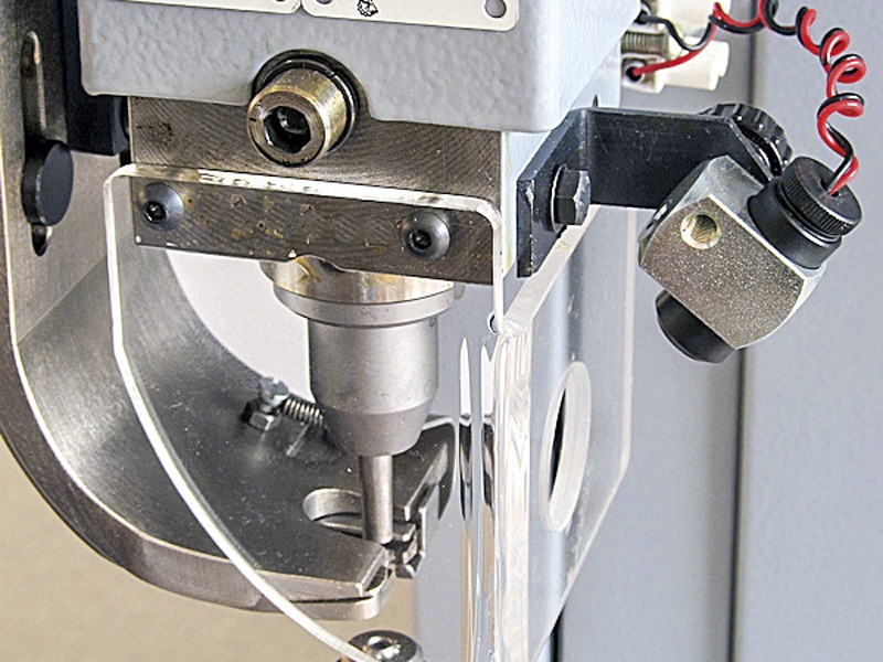 Guía regulable para ojalillos, con mesa, herramienta y motor.