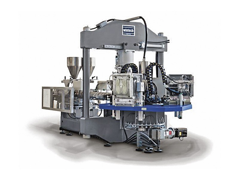 Inyectora compacta con tres estaciones para suelas y fondos termoplásticos.